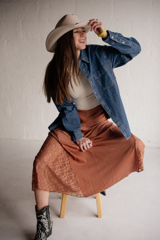 LACE TRIMMED MID-RISE SATIN MIDI SKIRT
