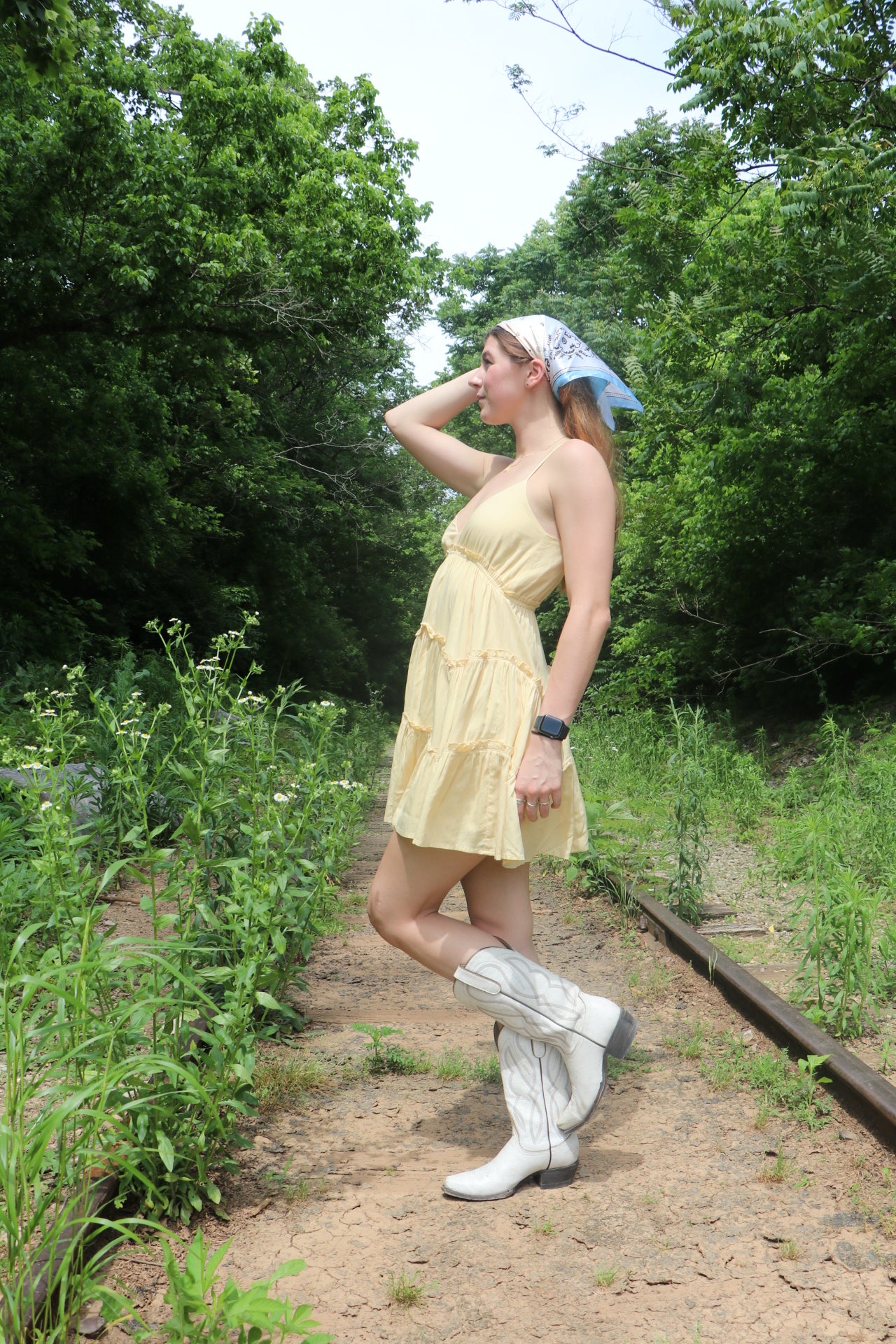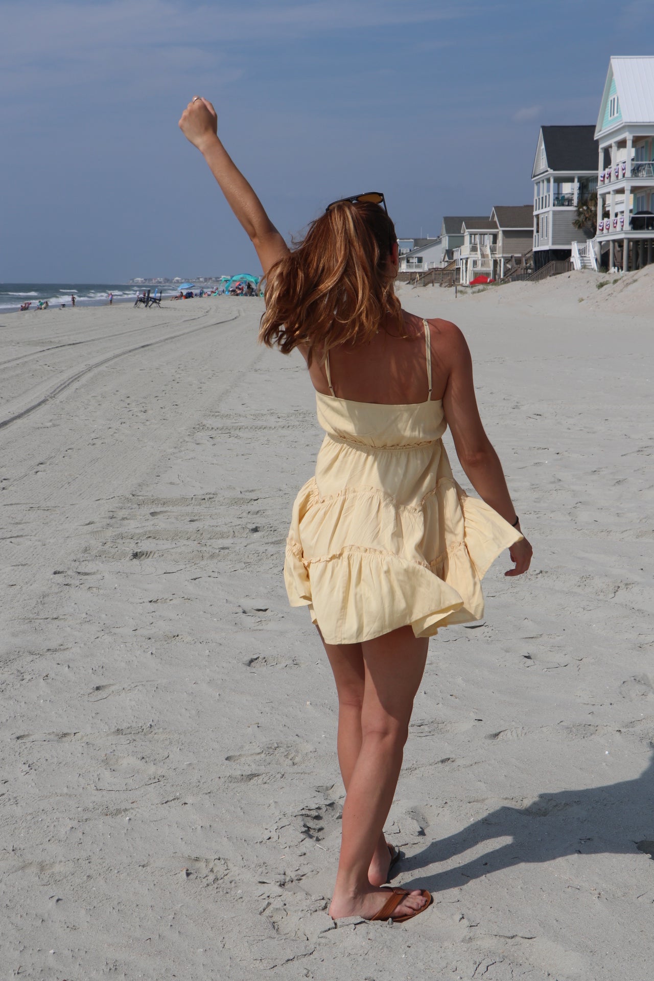 Featuring fun and flirty ruffle tiered skirt, v-neckline, adjustable cami straps, and pale yellow color perfect for any occasion your summer holds.