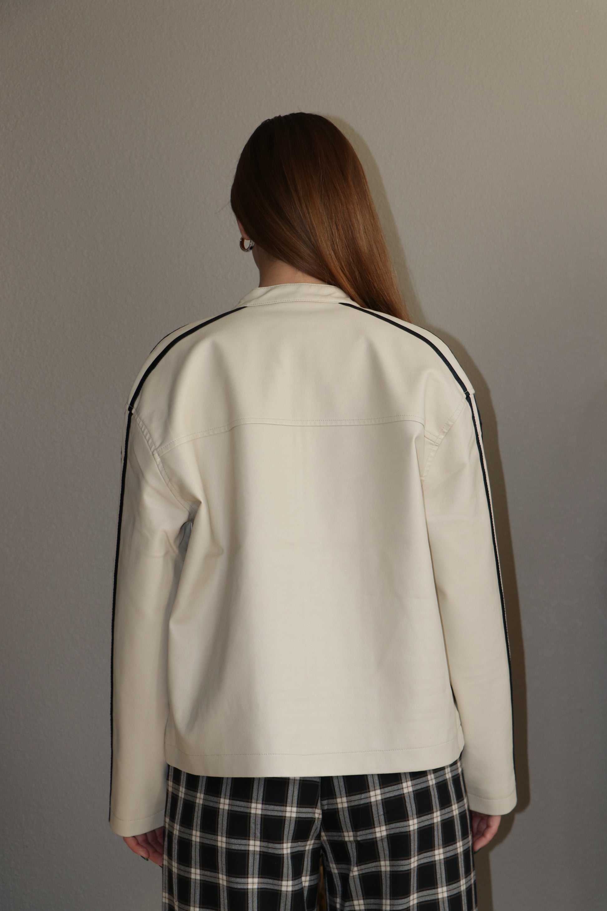 LONG SLEEVE WITH LINE DETAIL WASHED EFFECT FAUX LEATHER JACKET