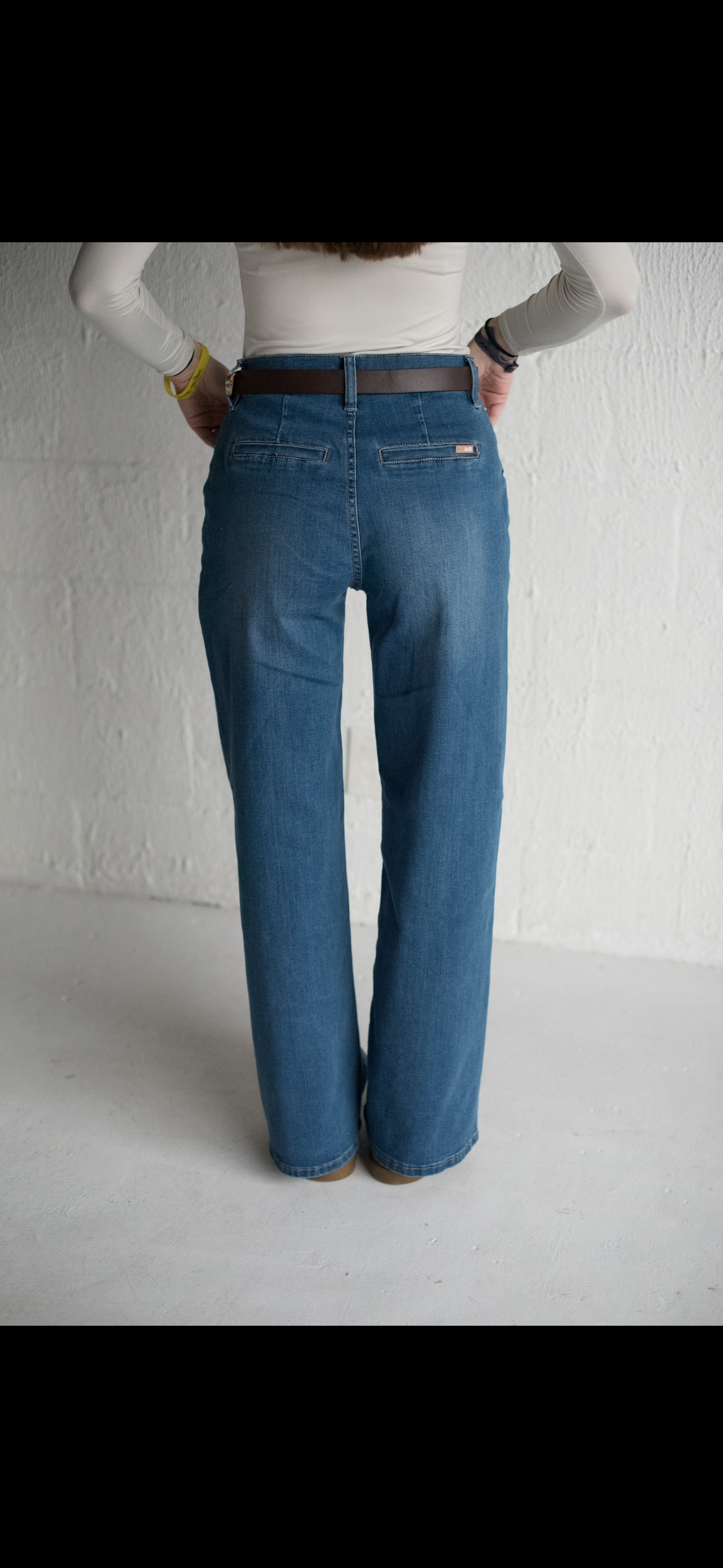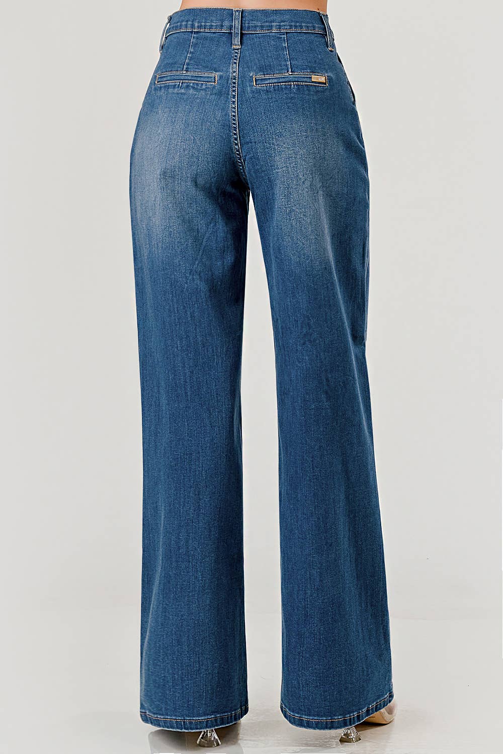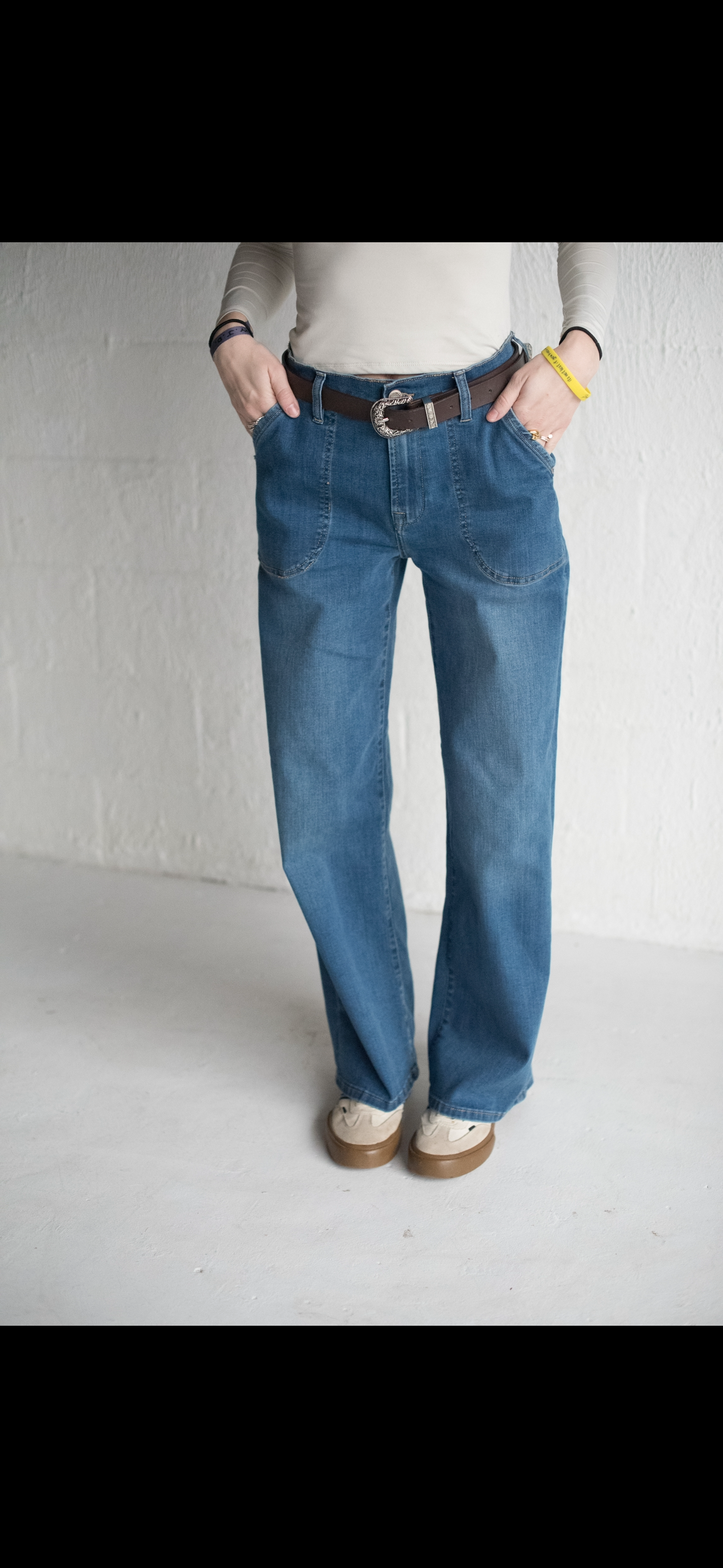 A classic look with all day comfort- The Medium Wash High Rise Patched Pocket Wide Leg Jeans offer an amazing fit with a stretchy fabric combination of Denim and Cotton. Featuring patch front pockets with stitching detail on the back and wide leg bottom for a vintage yet trendy style!