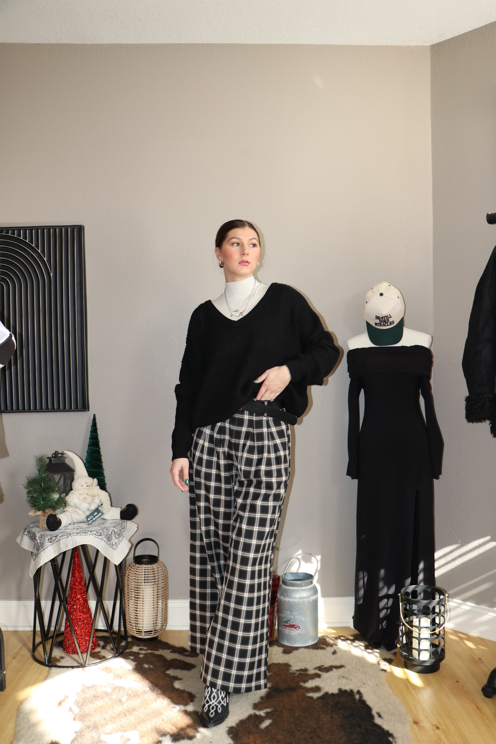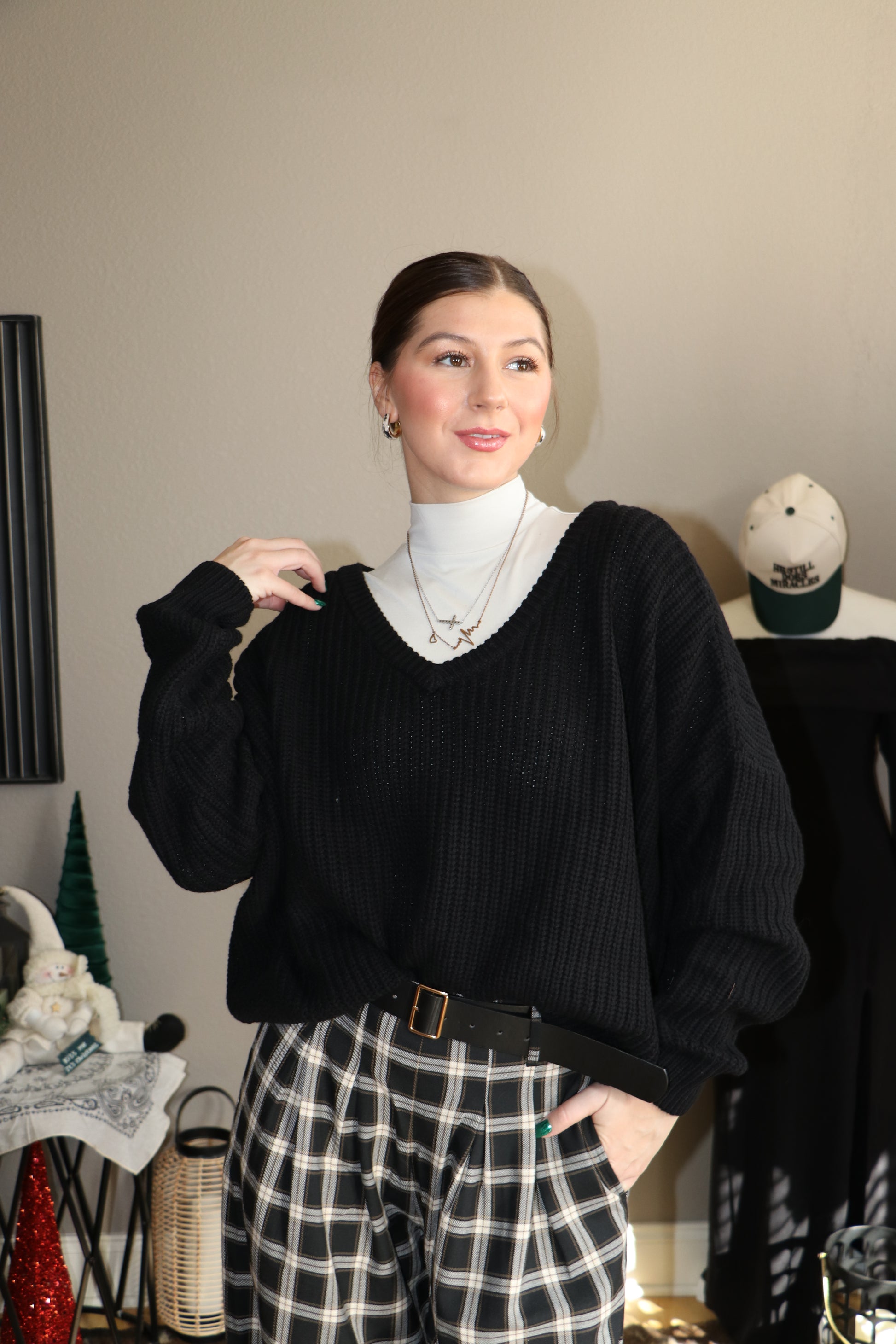 Relaxed-fit knit sweater with a deep V-neckline, soft ribbed texture, and drop-shoulder sleeves for a laid-back drape. Versatile for layering over collared shirts or pairing with tailored bottoms for elevated boutique styling.