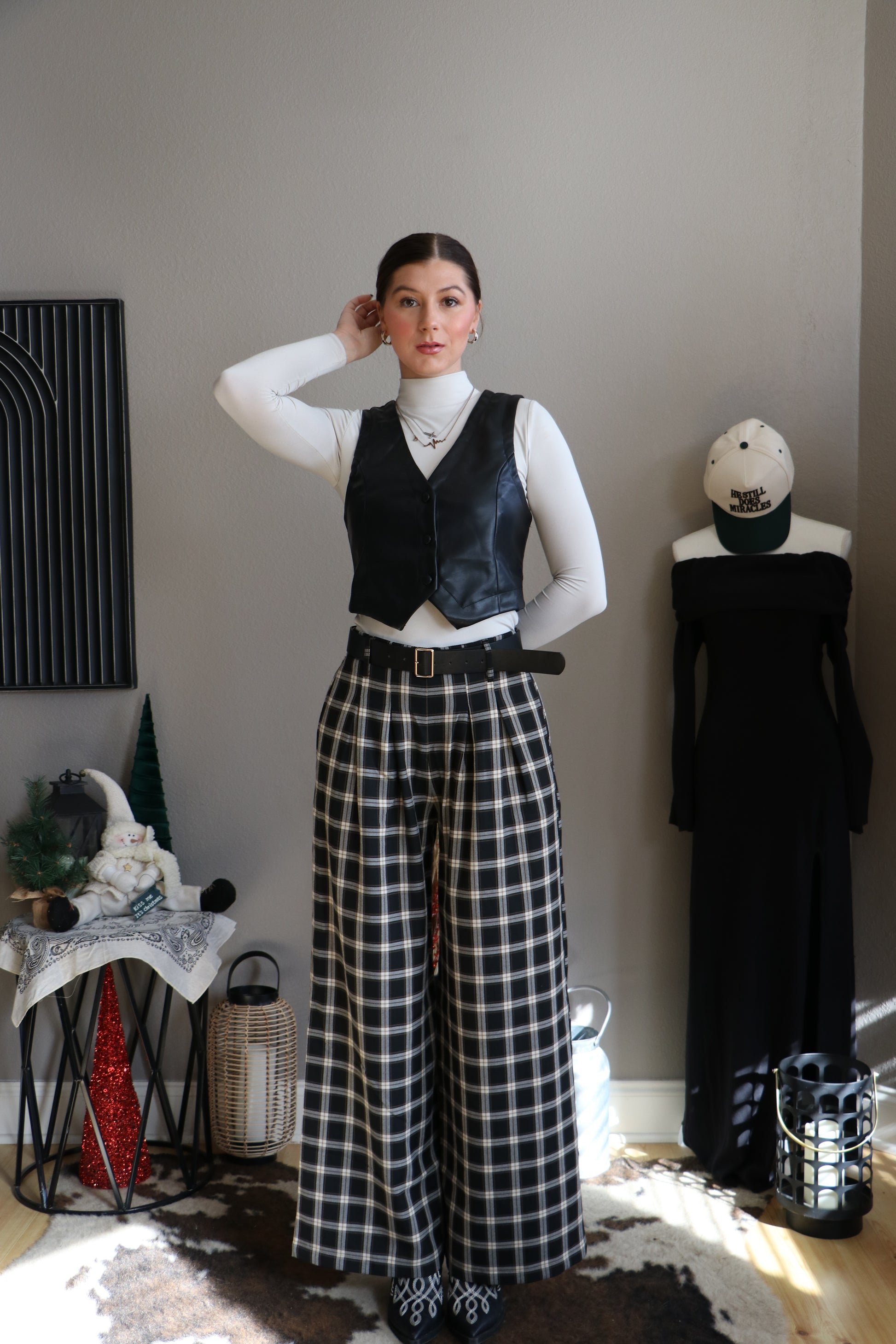 PLEATS DETAIL WITH BELT SIDE ZIPPER PLAID WOVEN WIDE LONG PANTS