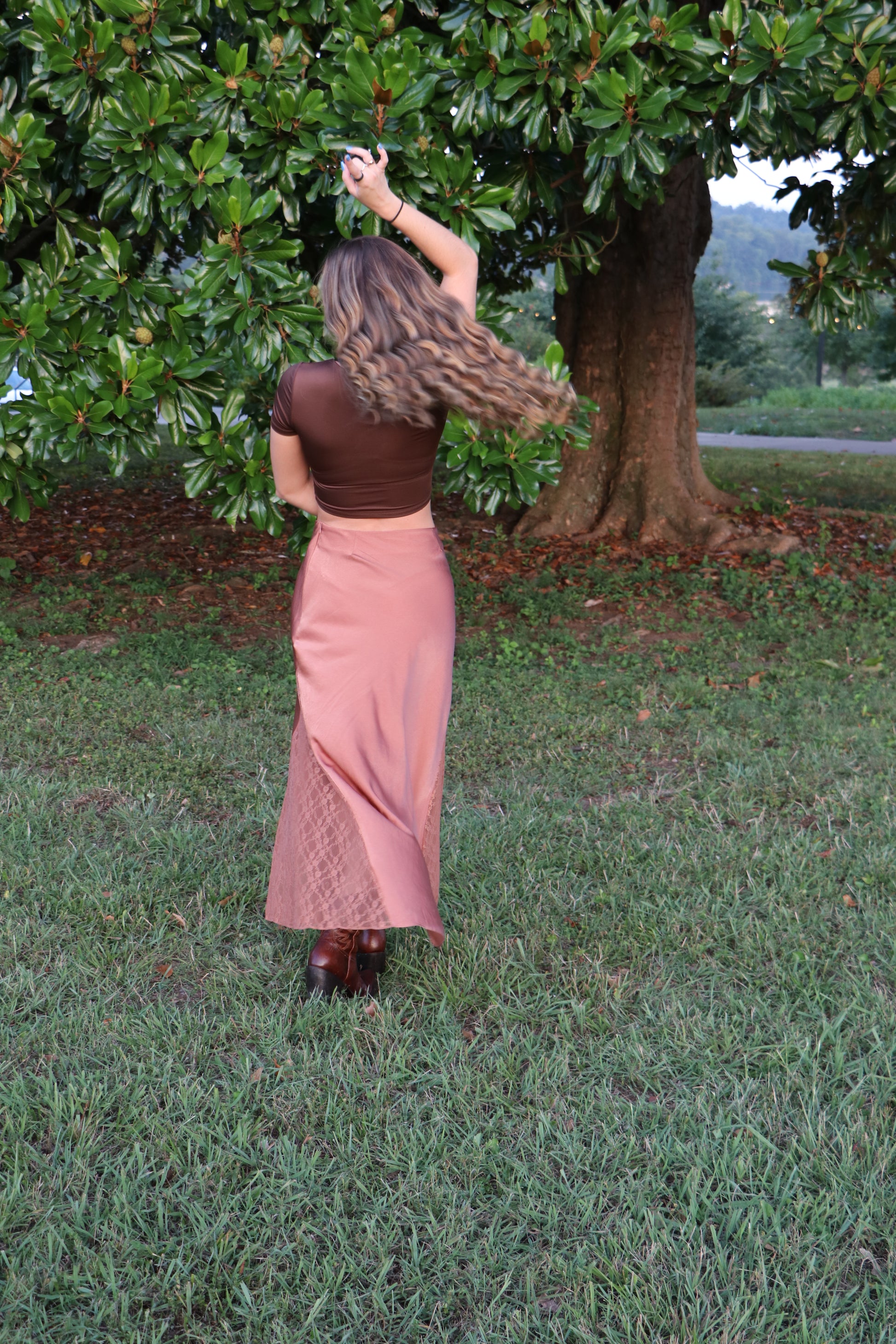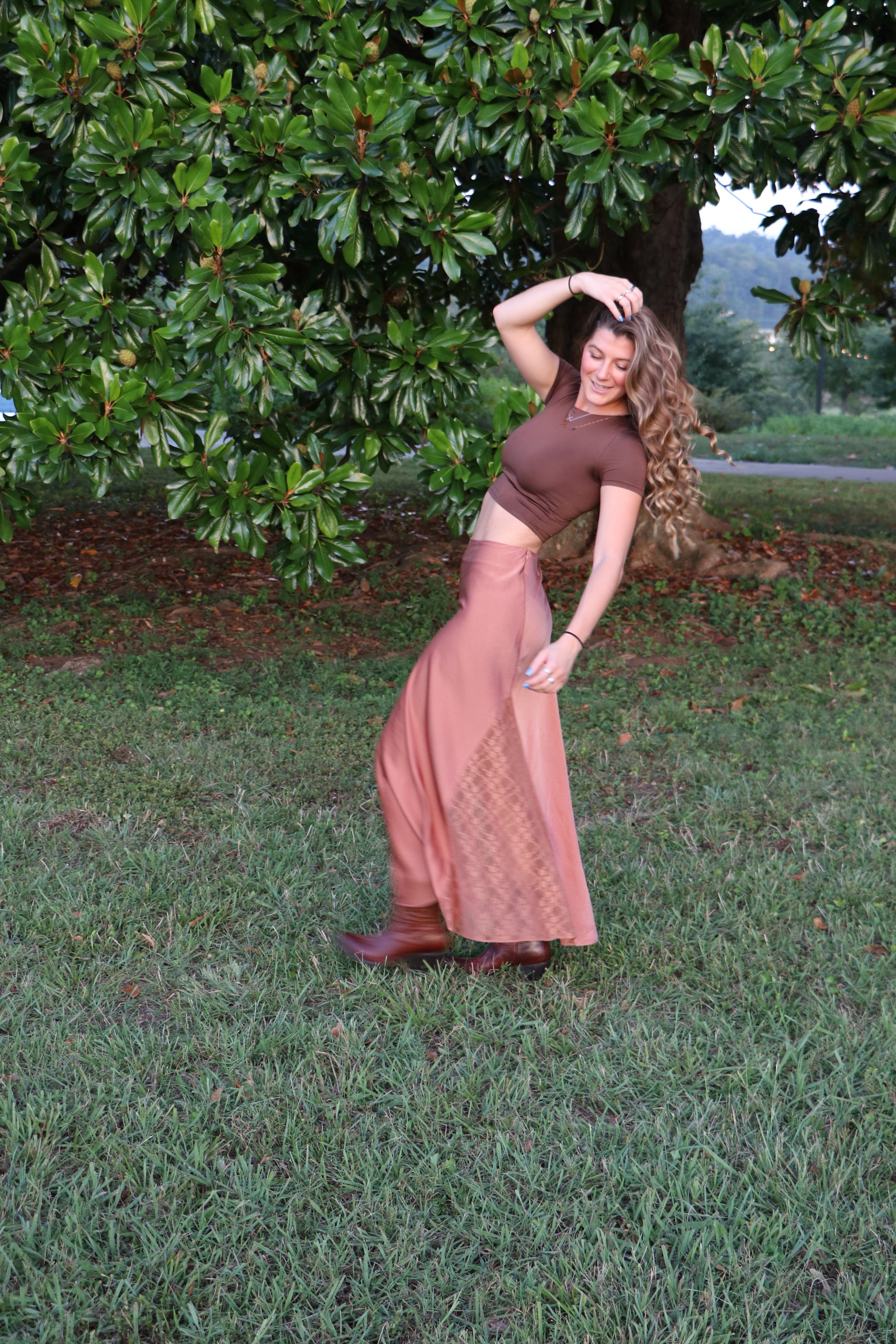 The Chocolate Round Neck Short Sleeve Crop Top Tee is a closet classic! A true basic that is seamless, fitted, and easy to style! The chocolate color is super flattering and perfect for fall and all seasons, especially with the western trends that are huge right now!