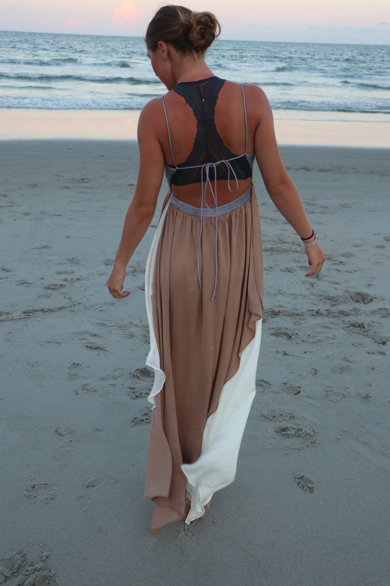 A color block, woven maxi dress with the following features: Semi-sheer chiffon fabric. Plunging neckline. Sleeveless. Layered, diagonal skirt. Wrapped tulip hem. Open back with self tie closure. Ankle length. Relaxed fit.
